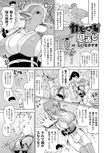 むかしむかし、ある村に住む青年の元へ助けたカモがネギを背負って恩返しにやってきた。首から下だけ艶っぽい人間の姿のカモを残念がる青年に、願うが適うネギで顔も美少女化するカモだったが、寒さに弱い人間の身体のせいで倒れてしまう。尻穴にネギを刺す民間療法で治療を試みる青年は、カモのアナルが柔らかいことに驚き指で尻穴を責めて絶頂へと導く。さらに、不思議なネギを使って少女を自分好みの巨尻へ膨尻肉体改造して、む…