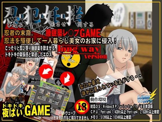 部屋に忍び込んで睡眠レ○プ! 危険な街を攻略しドキドキ夜ばい妊娠ゲーム! ◆忍者の末裔が現代のレ○プ魔となる! 忍法を駆使し、一人暮らし美少女の部屋に侵入。 こっそりと睡眠薬を使用し妊娠レ○プを成功させよ! 何度も繰り返し○し続け、妊娠させることが出来るか? ◆ゲームパートとノベルパートの2部構成 1ゲームパート ◇あやしい姦淫の…